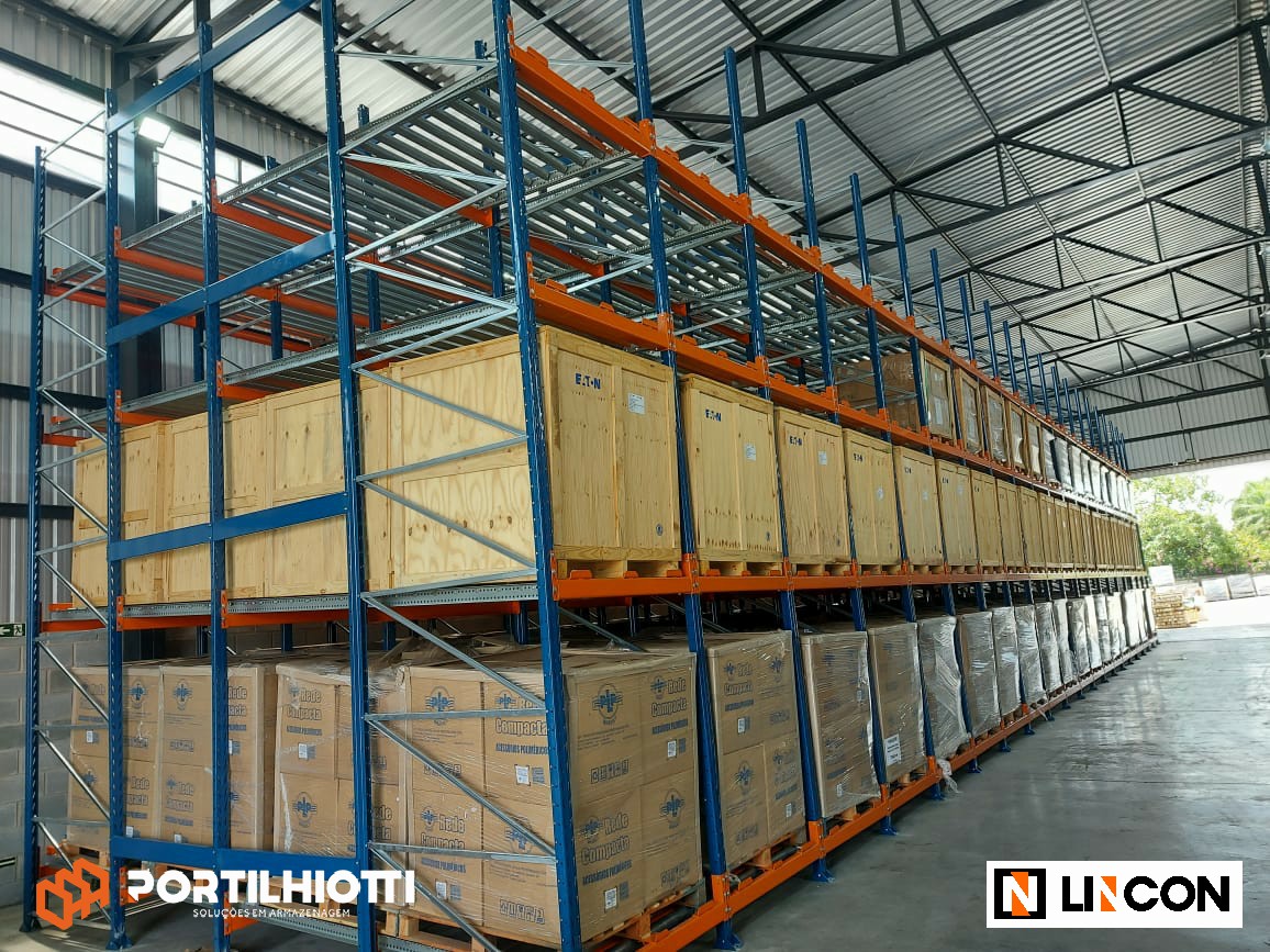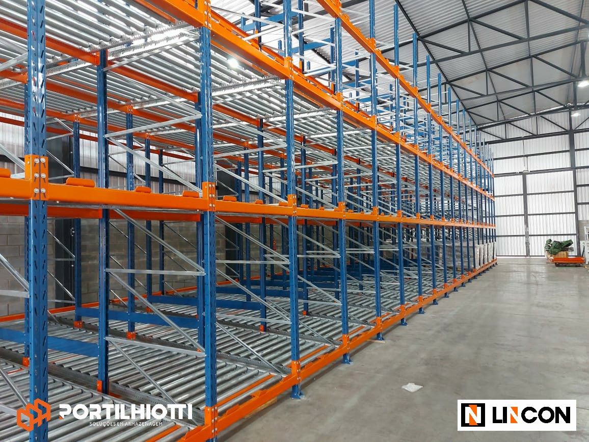 SISTEMA LIFO (Last In, First Out) por gravedad. En los sistemas de ruedas o rodillos la carga de la mercadería se realiza desde un “pasillo de carga”, las ruedas o rodillos montados sobre las guías en desnivel permiten que la carga se deslice desde otro pasillo llamado “pasillo de descarga”. Los sentidos de caída pueden combinarse para generar áreas de Picking. Estos sistemas pueden fabricarse para Pallets (Pallets Flow) o para cajas o gavetas (Carton Flow). El Picking puede realizarse por posiciones completas o fraccionado sobre la misma estructura de Racks. Otro sistema denominado Dinámico es el Push Back conformado por carros encastrables (telescópicos) sobre los cuales se colocan los pallets, cada pallet al ser empujado por otro deslaza el carro liberando un nuevo carro para deportar el pallet sobre él. En éste sistema se utiliza un solo pasillo para carga y descarga y puede combinarse con Pallet Flow o Carton Flow para generar un área de Picking inferior y un área de depósito superior. Estos Sistemas son ideales para productos con vencimientos, centros de preparación de pedidos, compras de congelado o refrigerado, áreas de alta rotación, depósitos con alto nivel de movimiento de carga y descarga.