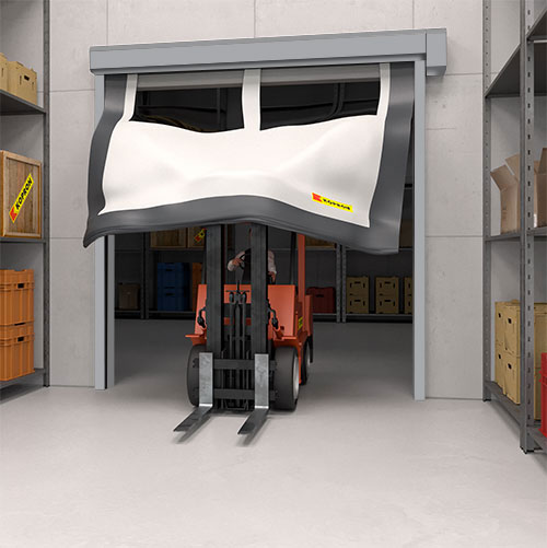 Puerta de enrollamiento rápido autorreparable que a las características propias de la categoría fast roll, añade una serie de guías laterales especiales de PVC antidesgaste autolubricadas, montadas en soportes oscilantes particulares que siguen el desarrollo de la lona. La puerta rápida se autorrepara después de un posible impacto accidental, la lona se desengancha de las guías laterales y en el ciclo sucesivo de cierre vuelve automáticamente en las guías auto restableciendo el funcionamiento.
