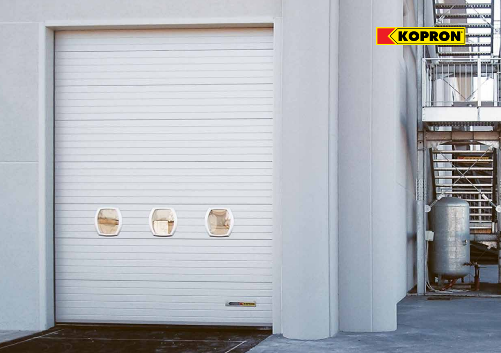 Las puertas seccionales de producción Kopron son la solución ideal para prestigiar desde un punto de vista arquitectónico y hacer más funcionales edificios industriales y comerciales, perfectas en lugares de paso frecuente, permiten aislar y seccionar departamentos asegurando siempre un rápido sistema de apertura y cierre.