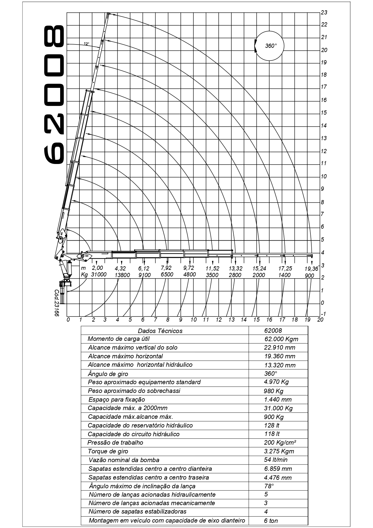 Compuesto por cinco brazos hidráulicos y tres brazos manuales, adecuados para camiones con un PBT mínimo de 6 toneladas en el eje delantero. Brazos delanteros telescópicos con sistema de extensión hidráulica, doble extensión hidráulica de las zapatas traseras, sistema de rodamiento axial en la columna giratoria, medidor de horas, manómetro, toma de fuerza, bomba hidráulica, aceite hidráulico y en el chasis.